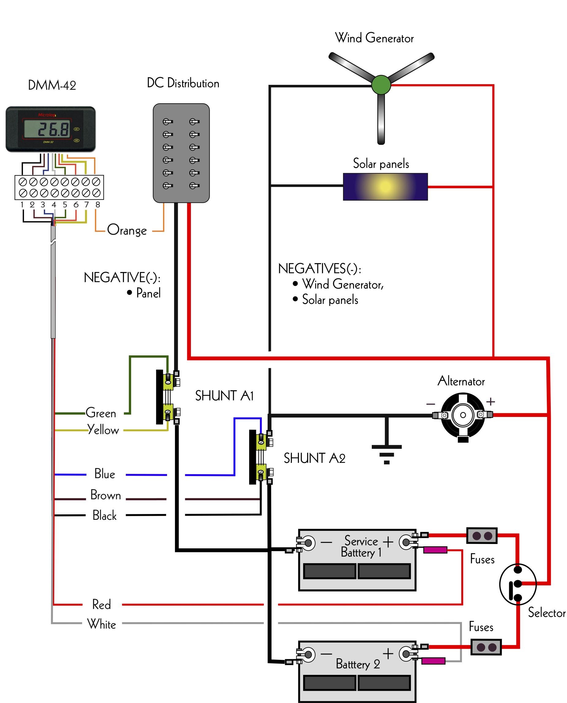 The Microlog DMM-3 / DMM-4 System will also monitor the intensity (Amperes) of incoming current from charging equipment such as alternators, wind generators or solar panels and/or, current consumed in your boat or RV. You can measure just charging or just discharging current if you prefer; or NET current circulation to your House bank, your choice. Charging current will be represented with a "+" sign and discharging current with a "–" sign.The instrument measures the slight potential difference between shunt terminals and translate this measurement in Amperes (Shunt is needed and optional, see below).